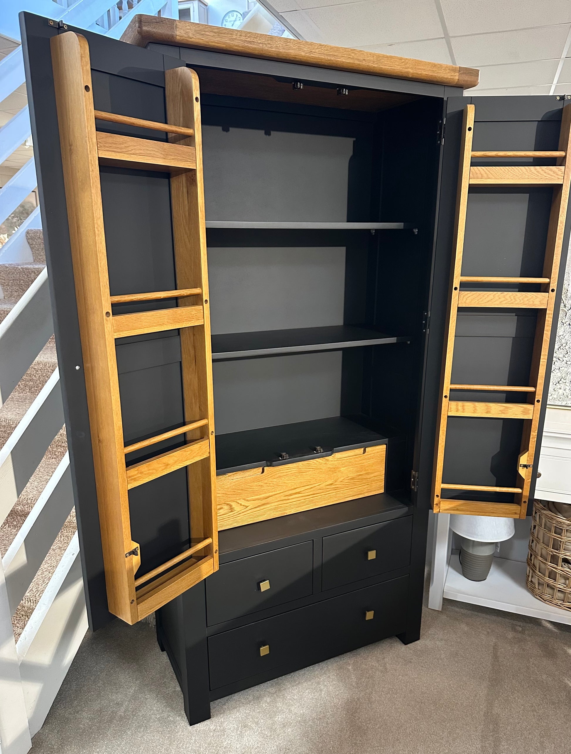 This sophisticated unit features a black painted finish, an oak top, and gold handles, offering a perfect blend of style and functionality. Delivered fully assembled for your convenience.