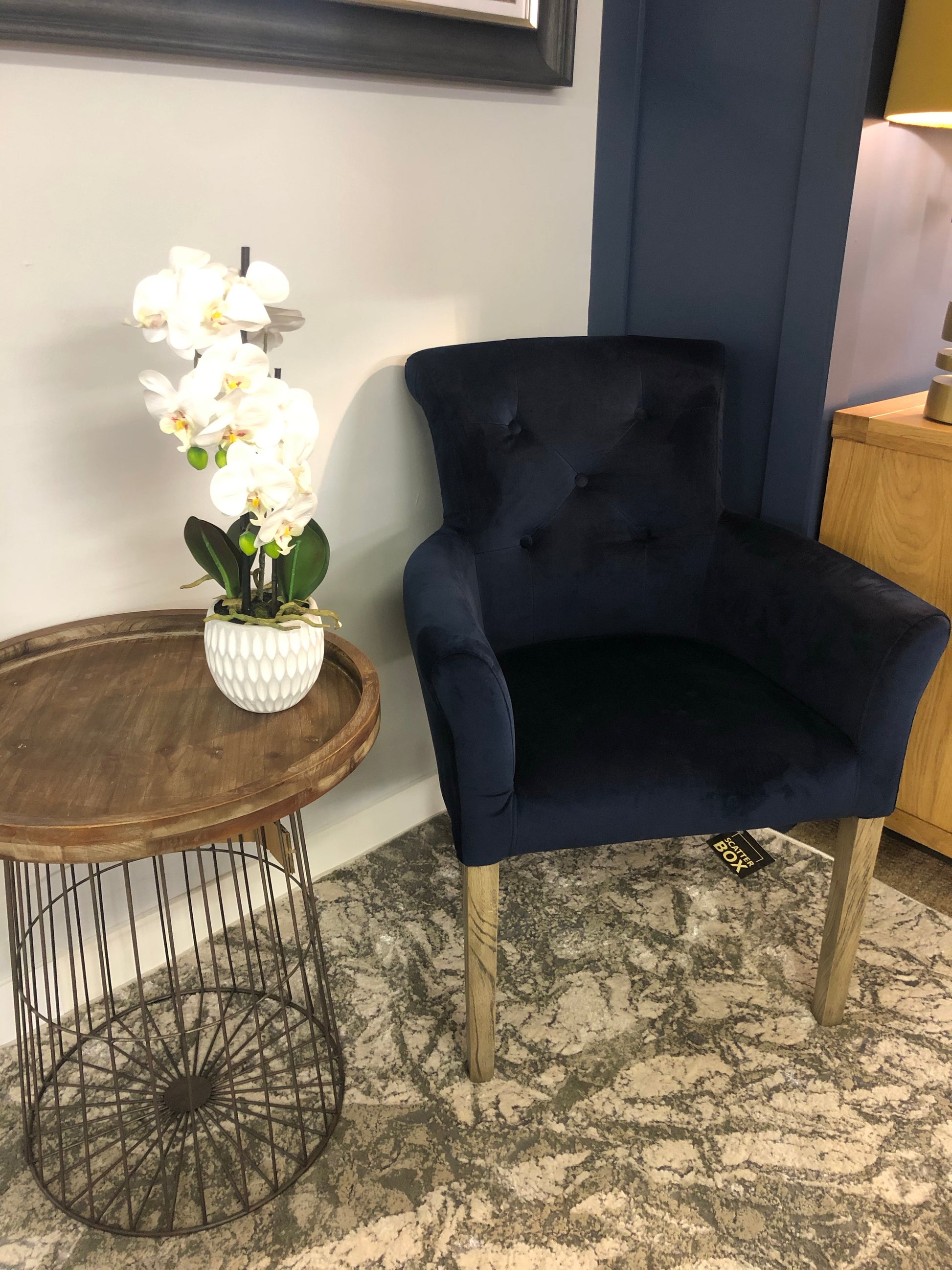 The Holly Accent Chair. Featuring curved buttoned back and solid wood grey wash legs.