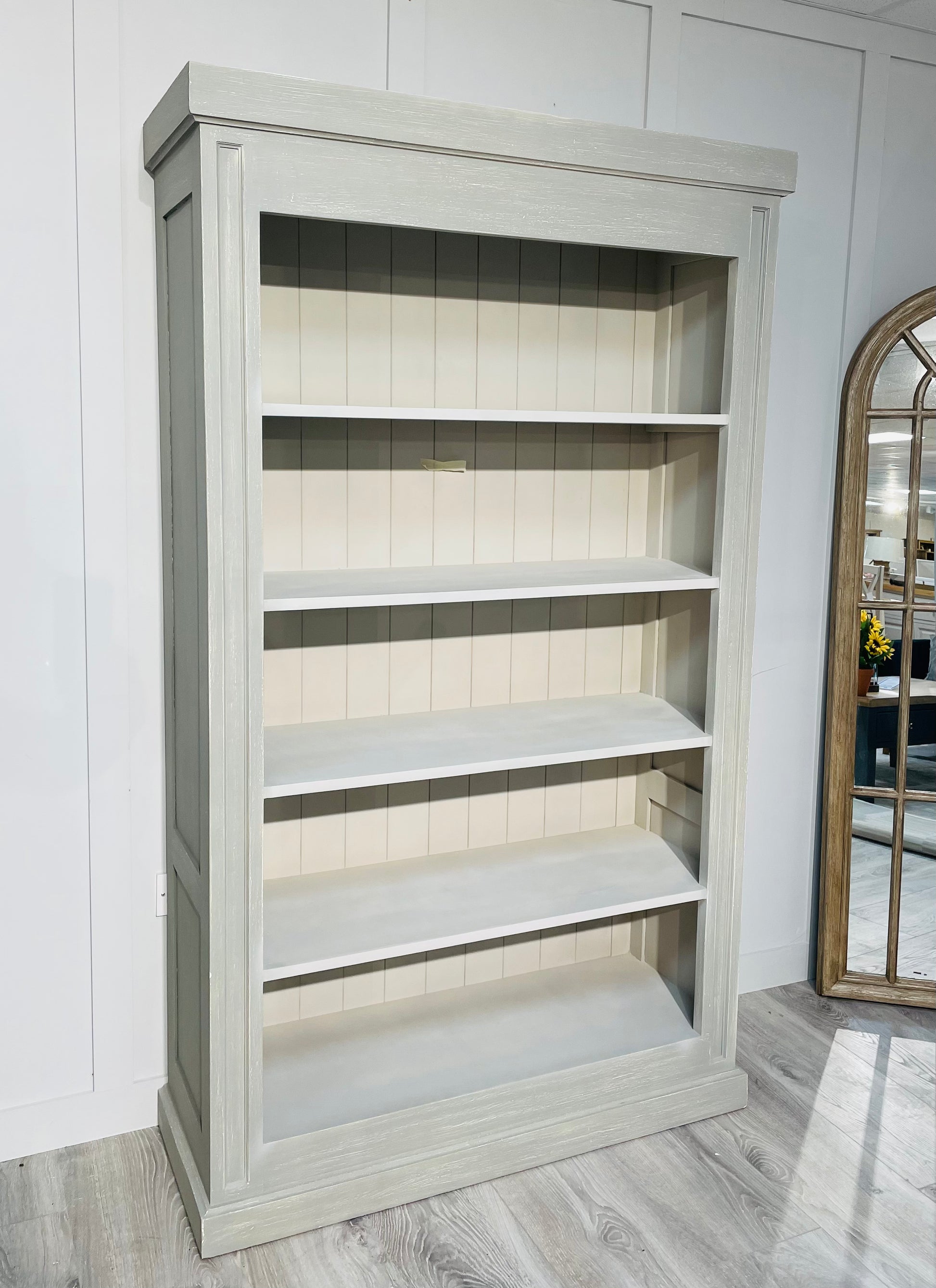 The Liberty large bookcase in traditional French style, Hand painted in stone grey and given a distressed finish with fretwork . The Liberty truly gives you the French look that will fit to any style of home.