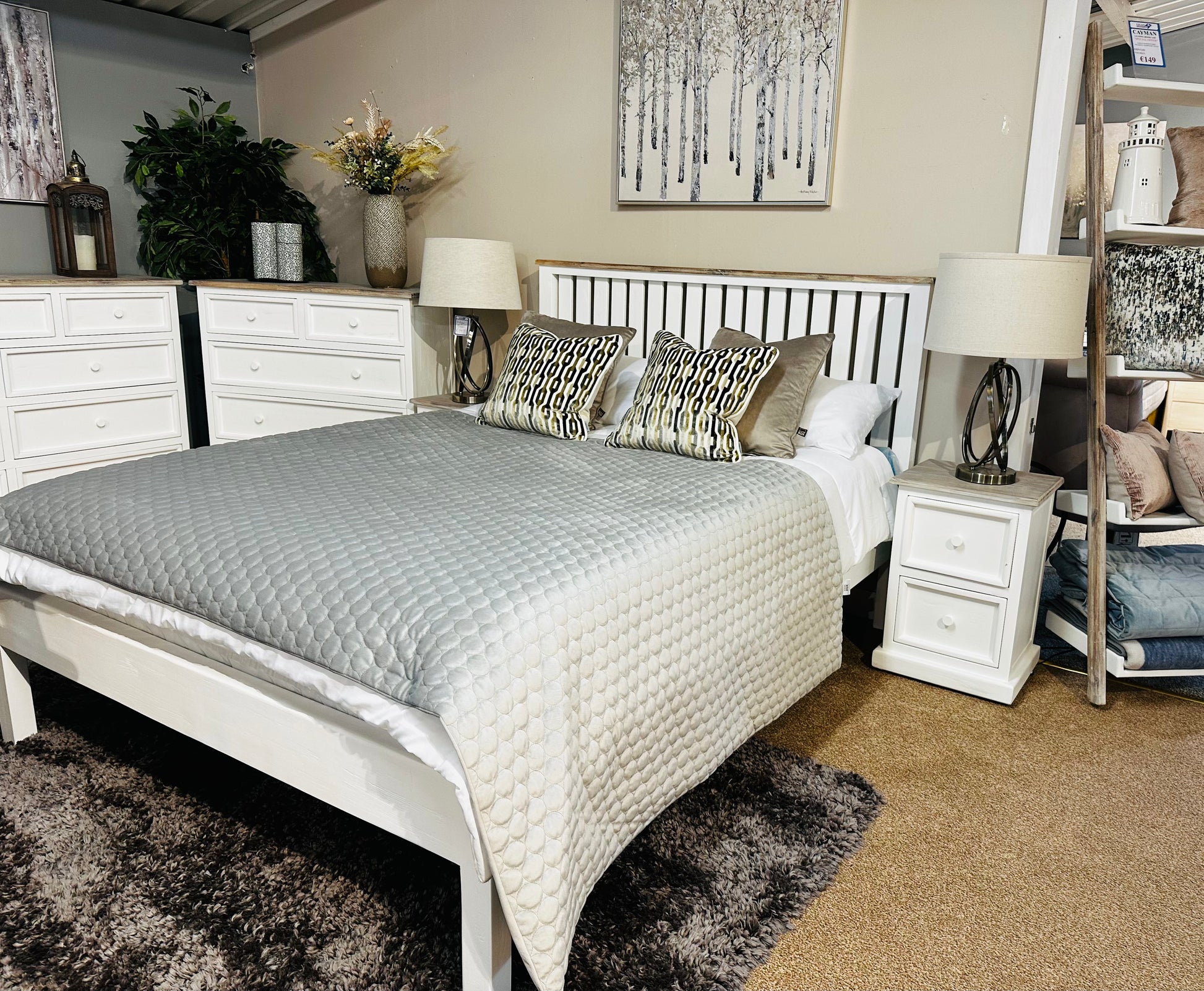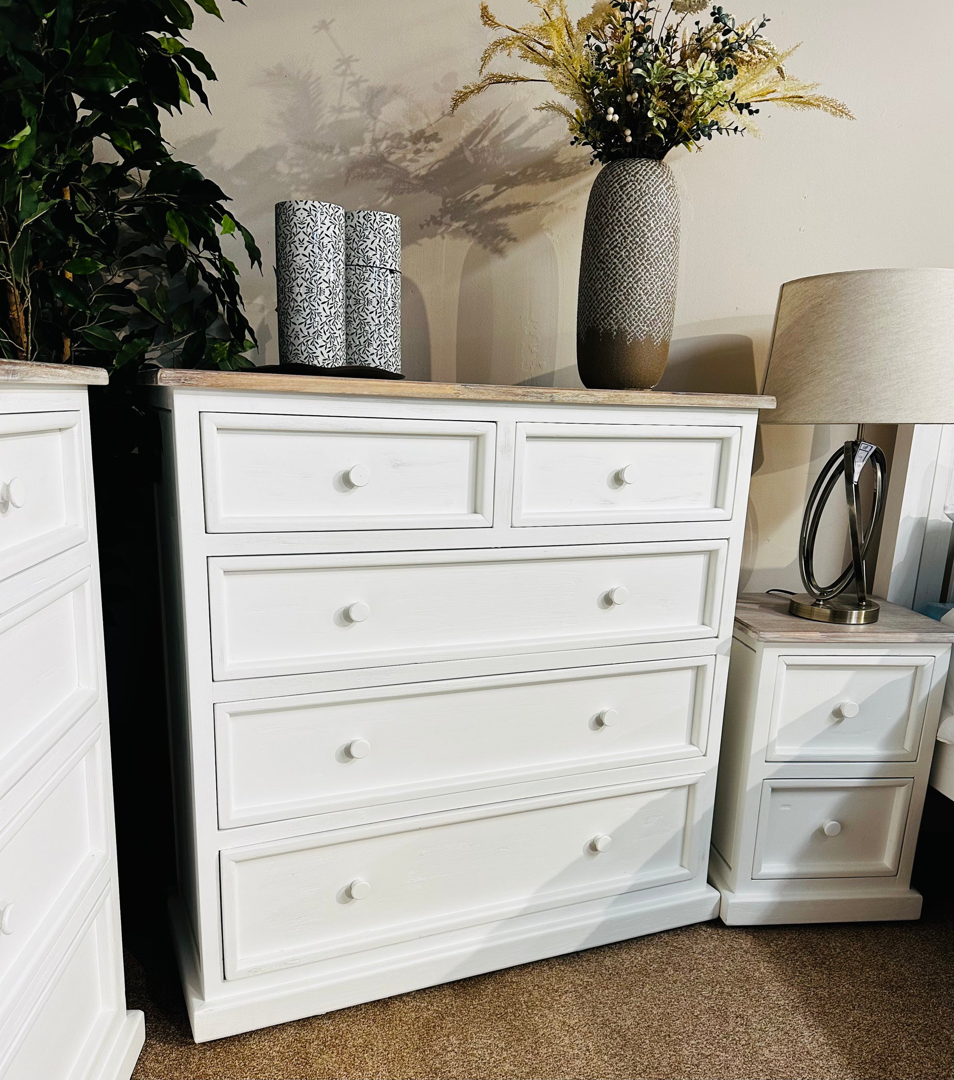This Cayman solid wood bedroom collection. Made entirely out of acacia wood hand-distressed in matte light grey washed effect top blend beautiful with the rustic white base., this shabby chic bedroom collection is a piece of furniture that is sturdy and oozes allure.