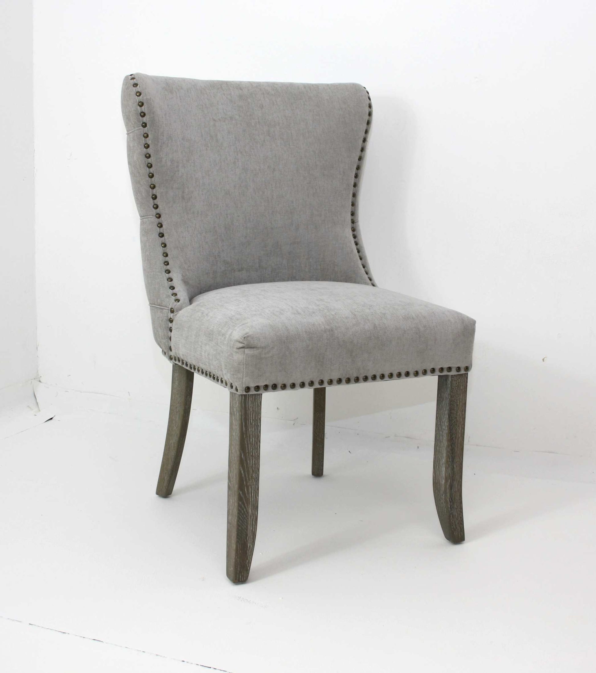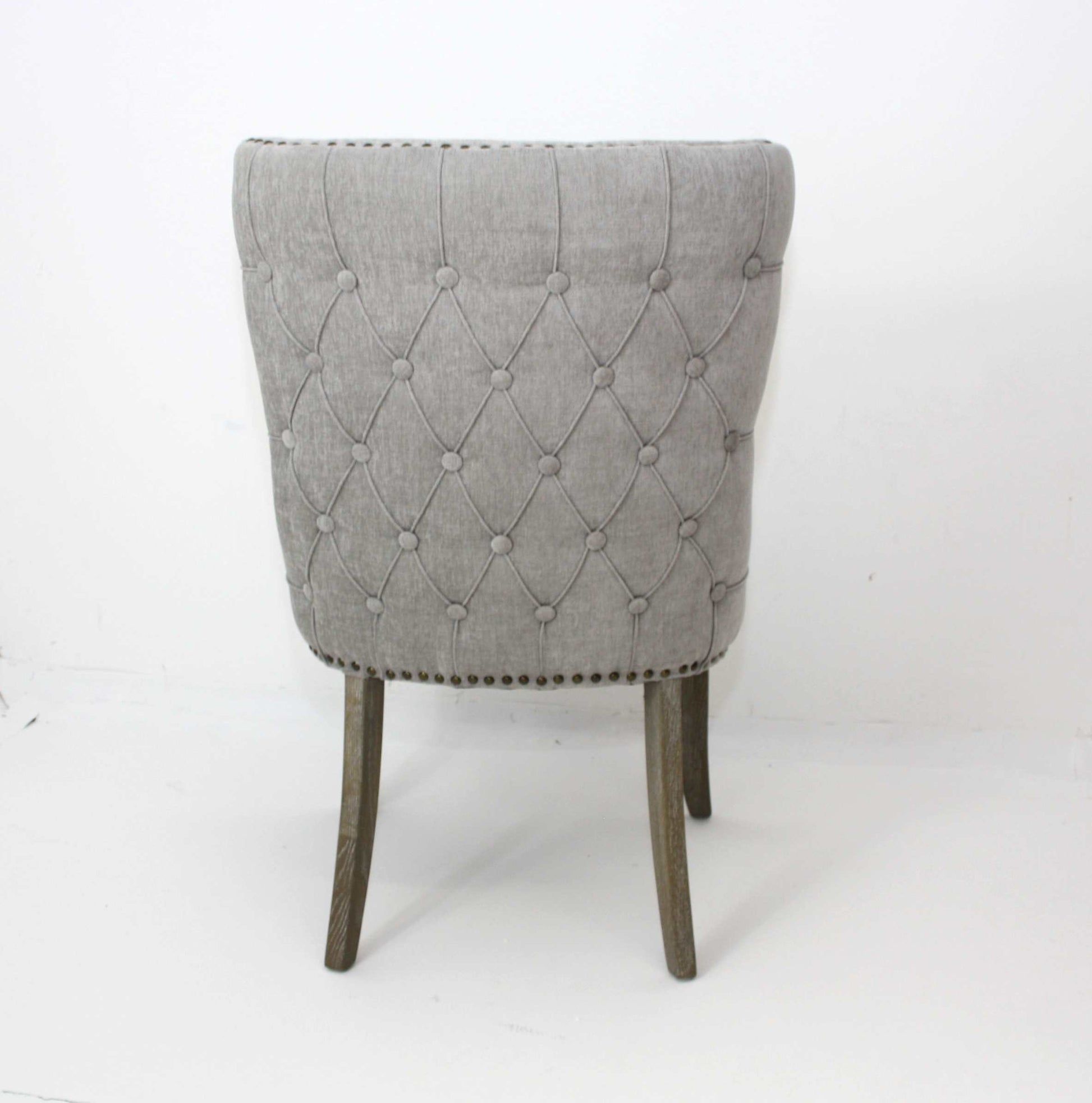 The luxurious Bantry dining dining chair with stunning details. deep-button back, studded edges, , soft grey fabric and oak legs
