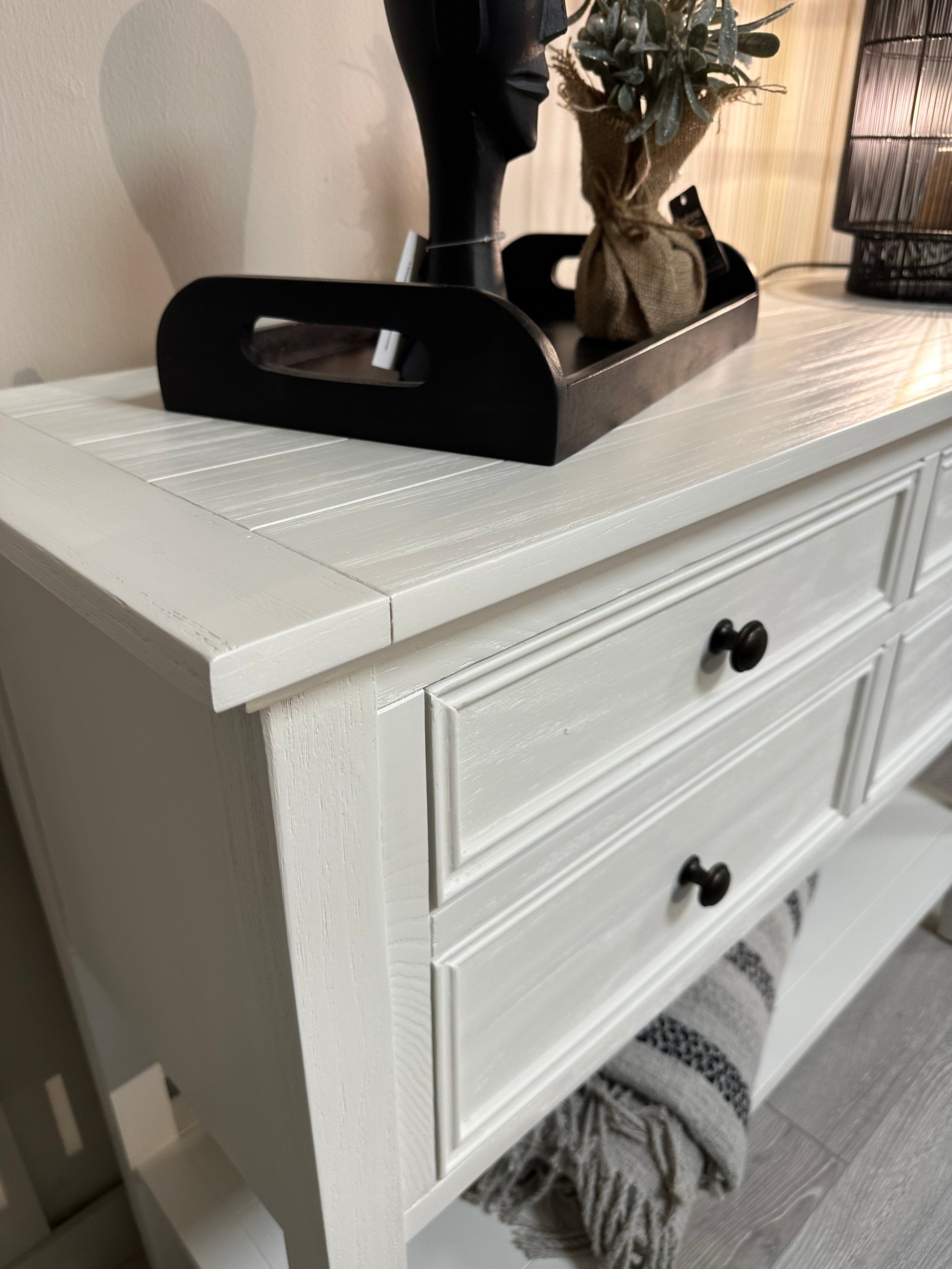The Palma white grain Wood 4 Drawer Console Table is a perfect blend of elegance and functionality.
